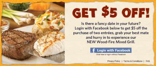 Log in with Facebook through the Outback promotional page and you will receive a coupon in your email for $5 off the purchase of 2 entrees at Outback Steakhouse.