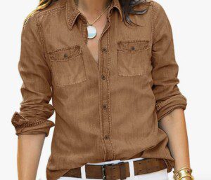 This cute Denim Button Down Shirt comes in 18 different colors and sizes XS – 3XL!  It’s 100% cotton and machine washable.