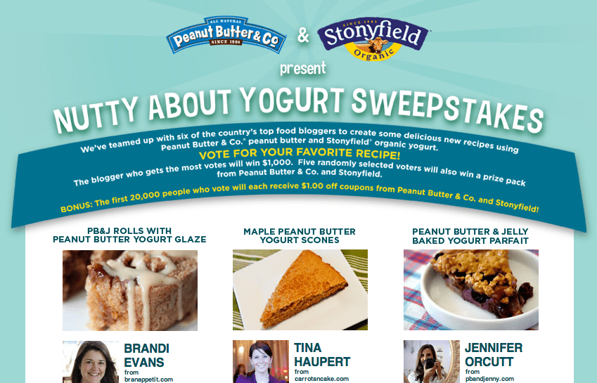 Cast your vote in the Nutty About Yogurt Sweepstakes and if you are one of the first 20,000 you can print 2 coupons for $1/1 Peanut Butter & Co. and $1/1 Stonyfield Organic Yogurt.