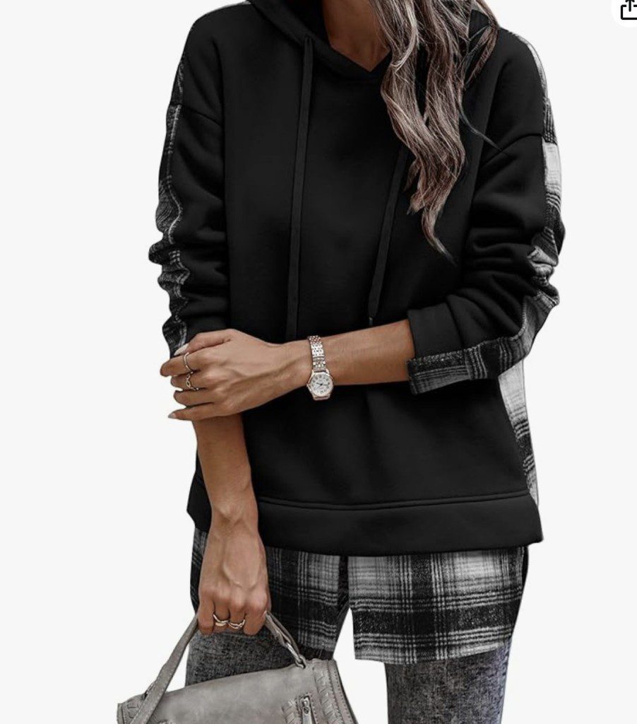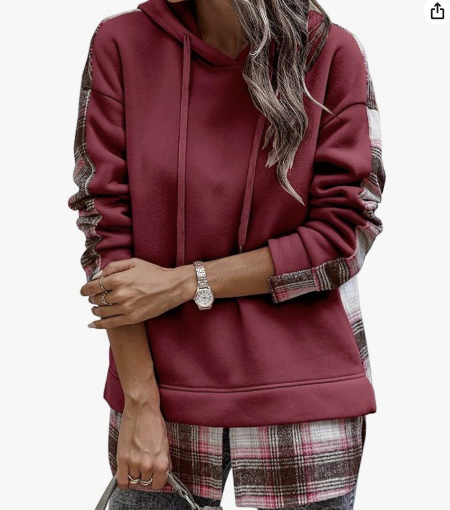 This cute Plaid Patchwork Hoodie comes in several colors and sizes Small to X-Large. It gives you that layered look but it’s all one piece!
