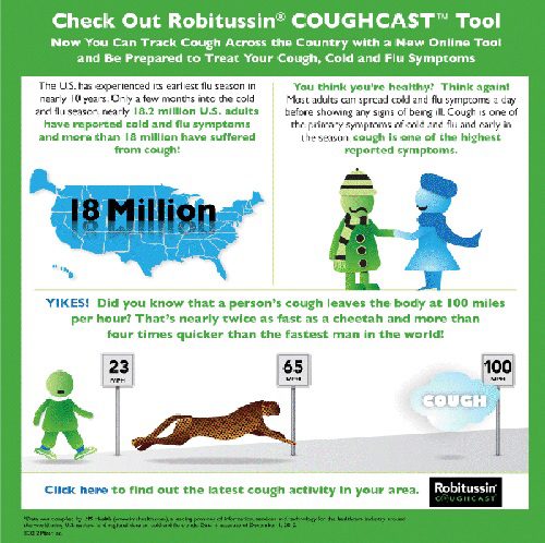 This year, Robitussin® wants to help make sure people don’t have to take any unnecessary and unwanted “time-out” from their busy lives due to a cough, cold or the flu. Cough is one of the primary symptoms of cold and flu and as the country approaches peak season, the makers of Robitussin® have introduced Robitussin® COUGHCAST™. This new interactive tool, available at www.Robitussin.com, allows people to track cough activity in their local area so they can be prepared to effectively treat their symptoms.