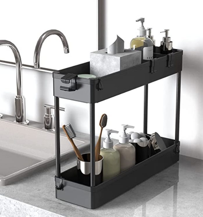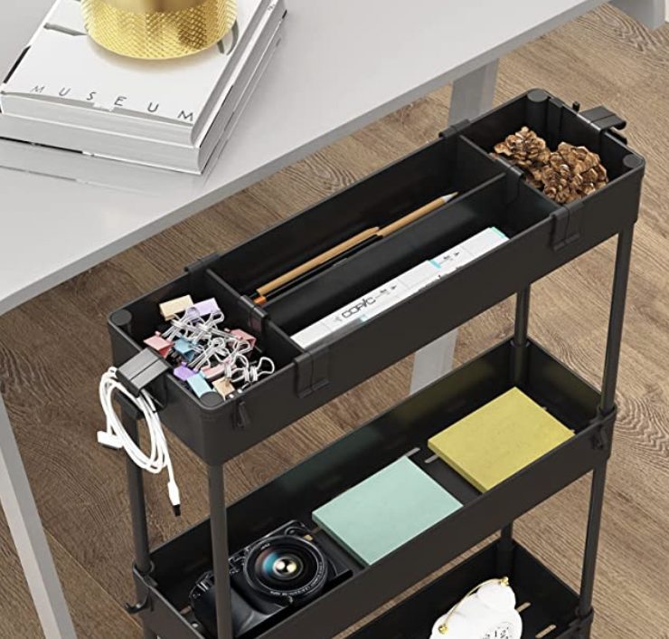 If you are tight on space and need some more storage, Amazon has this 4 Tier Slim Storage Cart for 50% off with the code below. It measures a little over 5″ wide. You can also use this on the counter top with 2 Tiers!